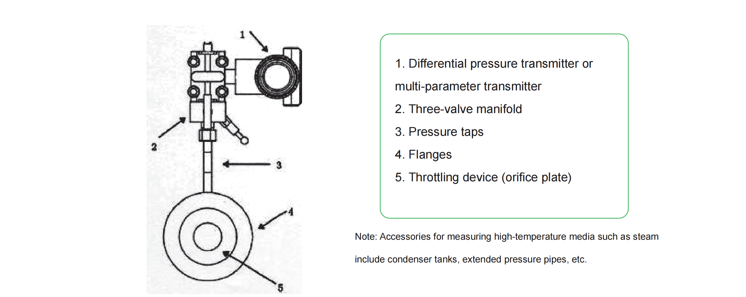 The orifice plate flowmeter itself consists of a high-precision differential pressure transmitter, a three-valve manifold, pressure taps, flanges, and a throttling element. During operation, the two end valves of the three-valve manifold are open, while the middle valve is closed. The medium flow direction must follow the direction indicated by the instrument and cannot be reversed. Its composition is shown in the diagram below.